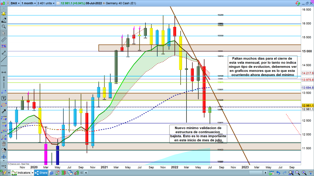 En el gráfico mensual del dax40, el detalle más importante en el análisis de hoy, es que hemos tenido un nuevo mínimo validando, con claridad, la continuación de estructura bajista. Las opciones, que ya eran insignificantes de estar en ondas iniciales de un movimiento alcista importante hacia zonas de nuevos máximos históricos, han quedado ya en nada. De momento la vela mensual no da ninguna información más, solo el detalle de que la zona de corrección del gráfico mensual está en la zona de los 13871 a 14100, detalle que como veremos en gráficos de tempos más pequeños podría ser interesante, aunque de momento son muy pocas las posibilidades de una corrección tan importante. Hay muchas zonas de resistencia importante en zonas intermedias, donde en principio parece más probable que finalice la corrección actual.