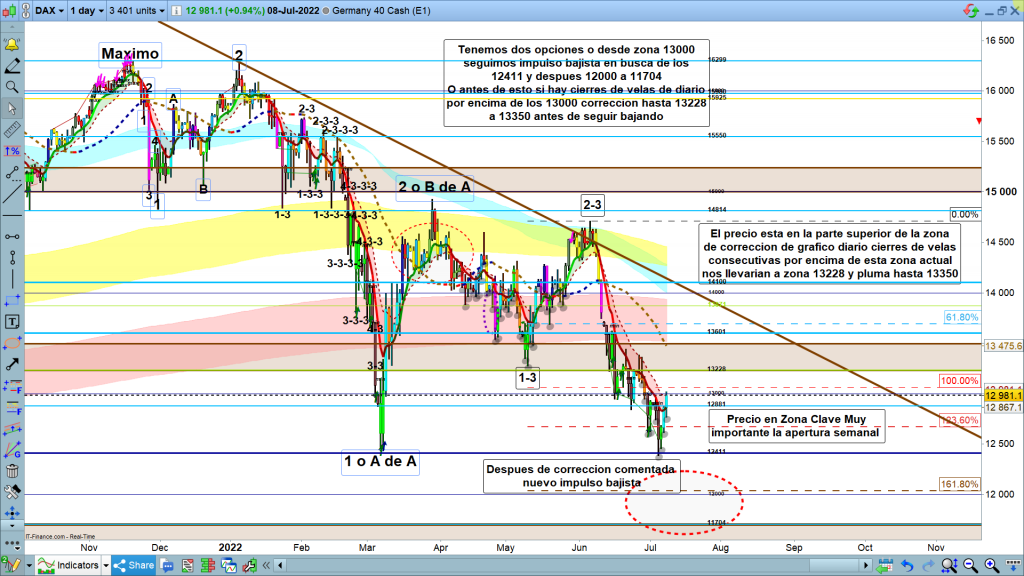 En gráfico semanal del dax40, vemos como ha sido esta semana, el testeo a 12411, con nuevo mínimo por debajo del de principios del mes de marzo, validando con claridad la estructura bajista en curso para el medio largo plazo. El rebote, después de alcanzar la cota 12411, ha sido realmente importante, como ya he explicado en el primer párrafo de este análisis, hasta la misma zona de la apertura semanal, incluso un poco más arriba un 0,5% por encima. El gráfico semanal no aporta tampoco información clara de la continuidad del corto plazo, como en gráfico mensual, lo más importante, la zona de corrección del gráfico semanal, este está en la zona, de soporte/resistencia, de grandes gráficos en 13228 a 13494, en principio parece que zona más factible en la actual corrección.