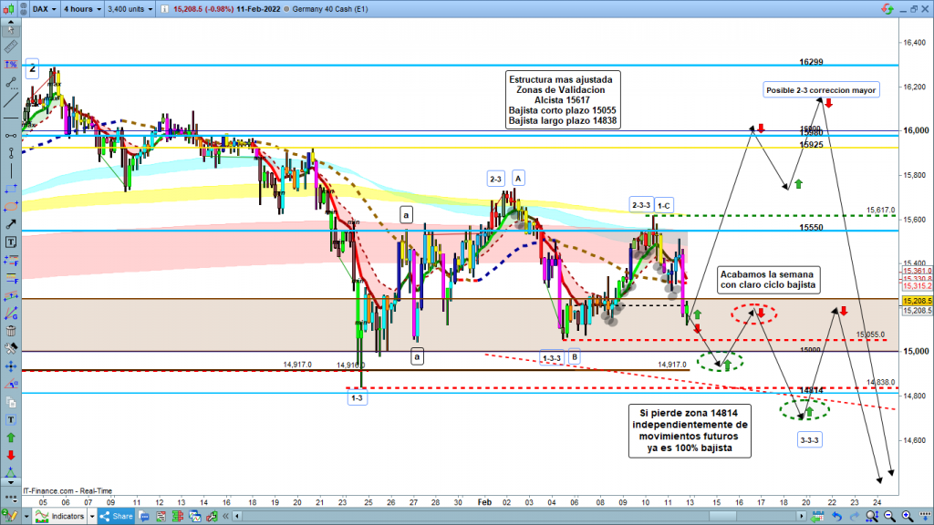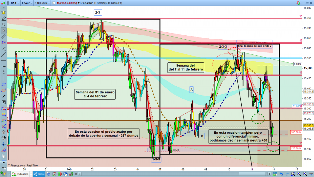 El pasado viernes 4 de febrero, el precio acabo con mucha fuerza bajista en la zona del 15056, veníamos desde los 15740, el miércoles en la vela de las 10 h de la mañana. O sea en 3 días casi 700 puntos de caída. Obviamente, este movimiento nos marcaba como más probable la continuación del rally bajista. Esta semana, la continuación del movimiento, era obvio que sería correctiva alcista, la duda estaba hasta donde. Corrección menor, o corrección doble o mayor dentro de la estructura en curso. Cuando hablamos de corrección menor o mayor, siempre es versus el gráfico sobre el que estamos analizando, para intradia normalmente analizamos en H4 y H1, sobre todo gráficos de 1 hora para ver mejor el detalle. En una corrección menor, de gráfico de 1 hora, podemos hablar de una corrección de 300 a 400 puntos de media, y una corrección mayor suelen ser de 550 a 750 puntos. En cambio, una corrección menor de gráfico semanal, fácil que hablemos de una corrección de hasta 3000 puntos, fractalidad del mercado.
