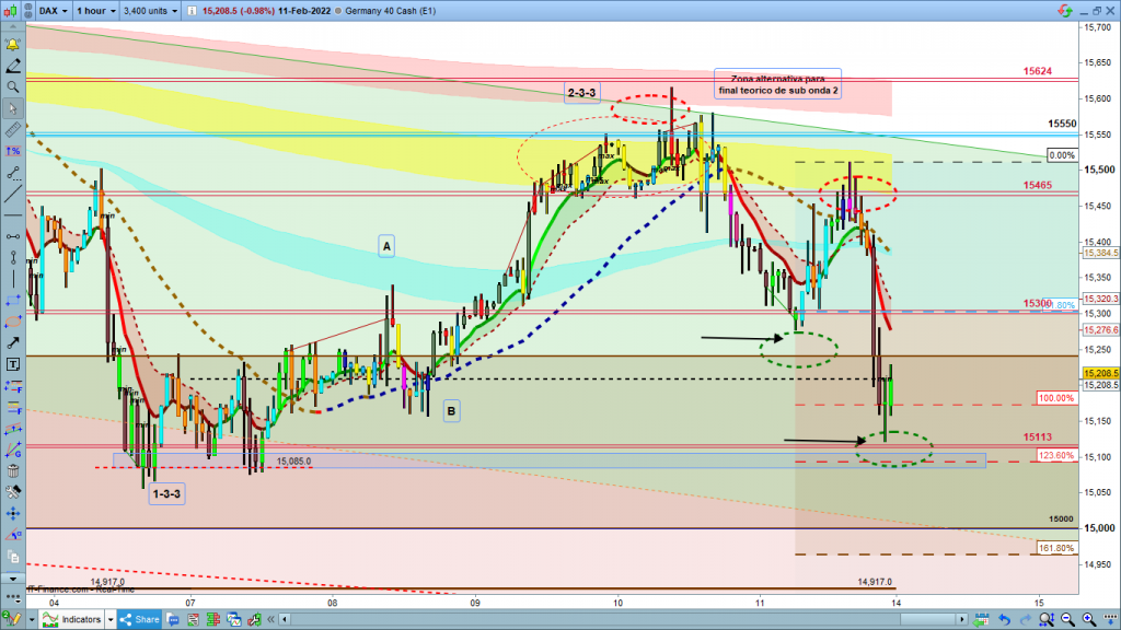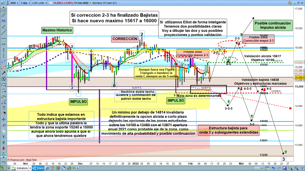 Por arriba un nuevo alto por encima de 15617, iríamos a corrección mayor de onda 2-3, o a nuevo impulso alcista, validación de esta última posibilidad, un nuevo máximo histórico, hasta ahora no contemplado. Trade de alta probabilidad, hasta la zona 16000 a 16100, en el caso de tener la validación por encima de los 15617. Estructura con los dibujos de ondas marcados.