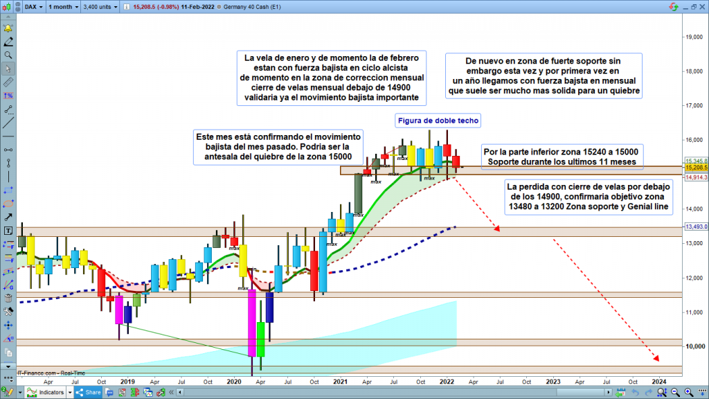 En gráfico mensual del dax40, imagen muy clara de la zona en la que nos encontramos. Son ya 11 meses en zona de rango 15000 a 16000. Por primera vez tenemos dos velas consecutivas (la actual en curso, sin finalizar), de fuerza bajista, pero aun en ciclo alcista. Sin embargo, la fuerza mantenida en esta zona da más probabilidades de quiebre de la zona de soporte 15240 a 15000. Muchas más probabilidades que cuando el sesgo era alcista o de corrección y posible cambio. El cierre de la vela de febrero, faltan aún dos semanas, si se produce por debajo de la zona 14900, las probabilidades de fuerte impulso bajista serán mucho más importantes.
