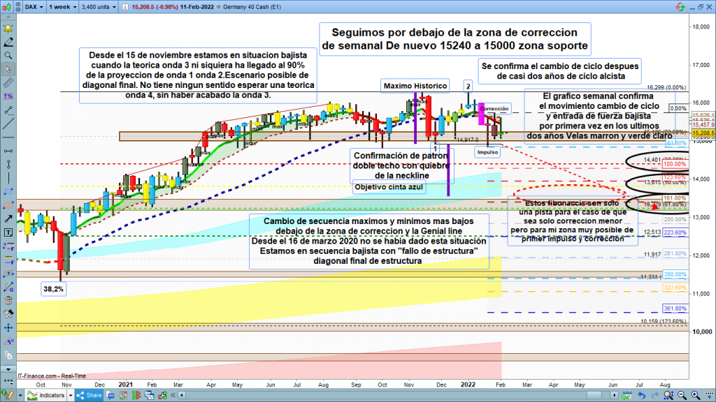 En gráfico semanal del dax40, de momento seguimos confirmando una y otra vez, y ya son 6 semanas consecutivas, el movimiento bajista después de la corrección que acabo en doble techo, o por patrón de cambio o 5 de ellas por debajo de la zona de corrección y de la Genial line. Estamos debajo de la zona de corrección, esta ha cruzado incluso por debajo de la Genial line, más confirmación de impulso bajista. Más resumido el estudio del gráfico semanal, casi imposible.