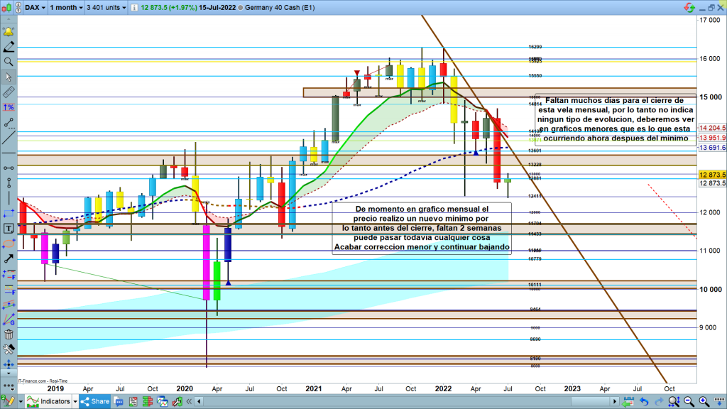 En gráfico mensual del dax40, muy poca información, estamos en el ecuador del mes y quedan todavía dos semanas completas para el cierre mensual. Lo más importante es el mínimo realizado de momento con la vela mensual, ya que esto valida, claramente, la continuación de la estructura bajista. Al final, solo las validaciones nos marcan los objetivos reales a alcanzar. Hasta que se producen siempre quedan las dudas de otras posibles estructuras por improbables que estas parezcan.
