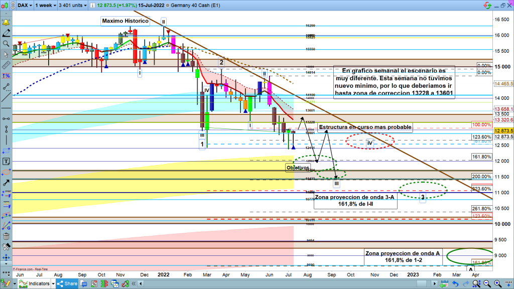 Dejemos a banda los grandes objetivos, estos datos son más para inversores, que para traders de derivados. Lo importante de esta última semana, en cuanto a los movimientos del corto plazo, es que la vela semanal, ha cerrado sin marcar un nuevo mínimo, con lo que lo lógico es que, el precio vaya hasta la zona de corrección de semanal, antes de seguir bajando. Esta zona de corrección semanal, está entre las cotas 13320, y los 13658. O sea, compartiendo una parte de la zona de soporte/resistencia de grandes gráficos entre los 13228 y los 13494. Fijaros que de momento tenemos una amplia zona coincidente importante como posible objetivo de esta probable corrección. Antes deberemos tener una validación técnica clara, para operar este probable movimiento y además en gráficos menores, deberemos buscar también las proyecciones matemáticas para ver donde estaría el objetivo a nivel técnico, a ver si también coincide o no con las dos zonas ya comentadas.