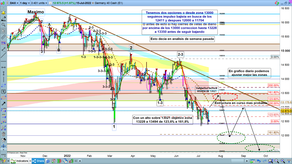 En gráfico de diario del dax40, ya empezamos a tener mucho más detalle. Recordemos Zona corrección semanal, 13320 a 13658, Zona de soporte/resistencia de grandes gráficos. 13228 a 13494. En gráfico diario, ya vemos la estructura en curso, VALIDACIÓN, con un alto por encima de, 13021, y zona de proyección, tenemos el 123,6% en los, 13217 y el 161,8% en 13460.