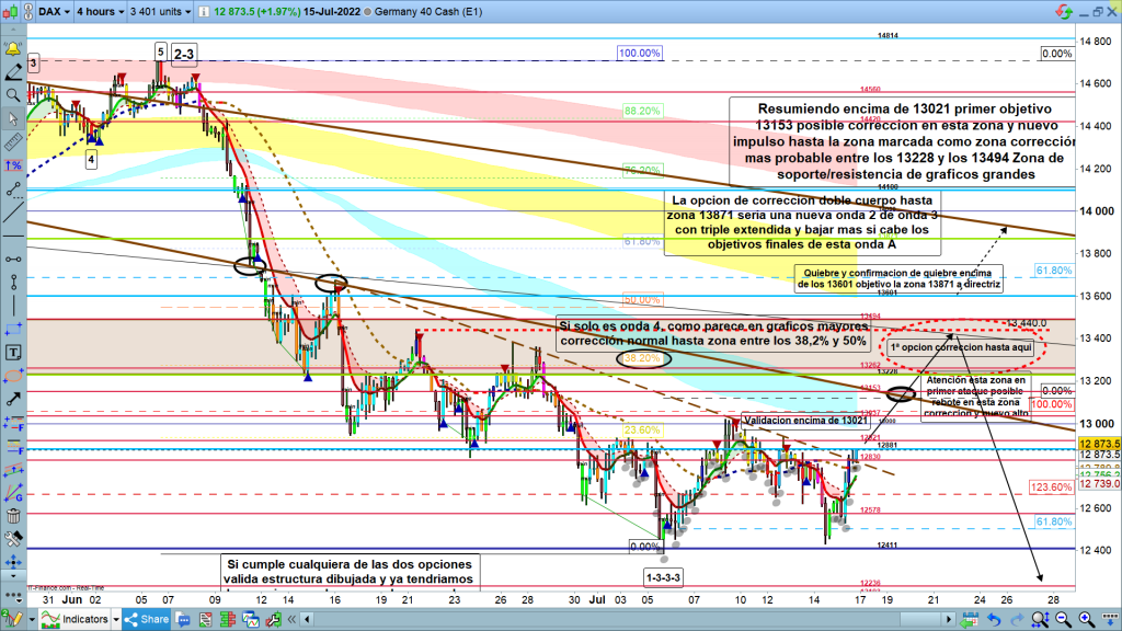 Si la opción, planteada, sea onda 4 o sea onda 2-3-3, donde el primer movimiento debería llegar hasta la misma zona mínimo de los 13320. En este caso, después de la VALIDACIÓN, por encima de los 13021, tenemos más de 300 puntos para gestionar con dos cotas a tener en cuenta los 13153 y los 13228.