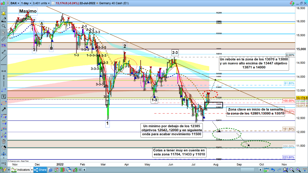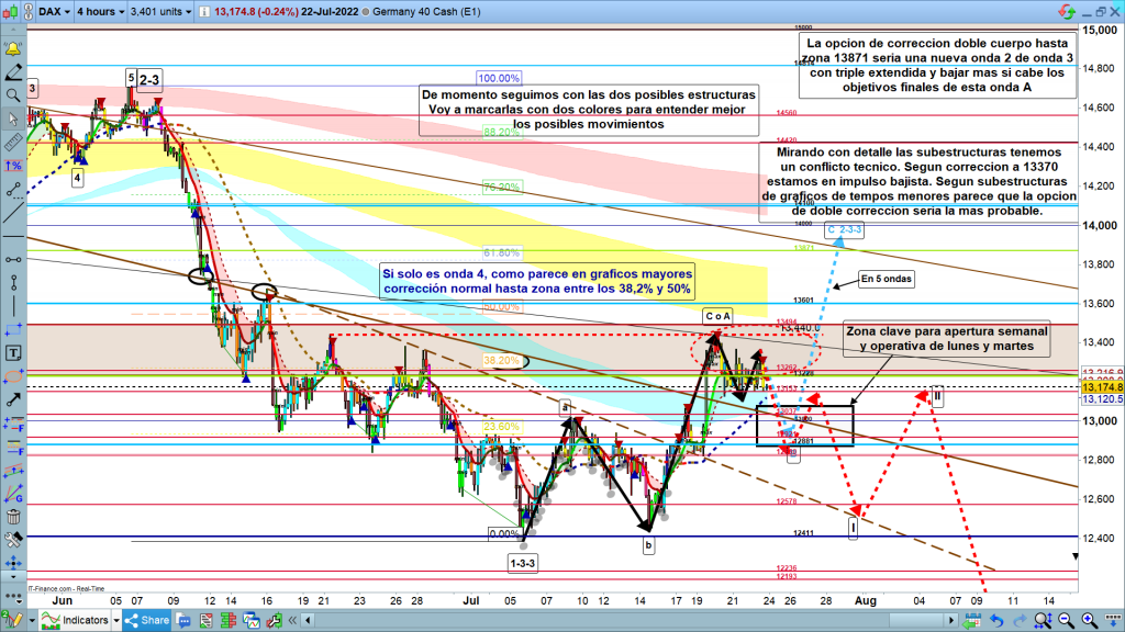 Antes de nada recordad, el Análisis general del dax 17 julio 2022. En él realizaba un detallado estudio de la estructura principal, la subida esperada hasta zona 13228 a 13601, se cumplió perfectamente, subió hasta los 13447. Y explicaba con más detalles la posible continuación, básicamente, o que tendríamos una corrección de doble cuerpo hasta la zona de los 13871 a 14000, o que este máximo en la zona, que acabo siendo en 13447, podría ser el final de la corrección para seguir bajando.
