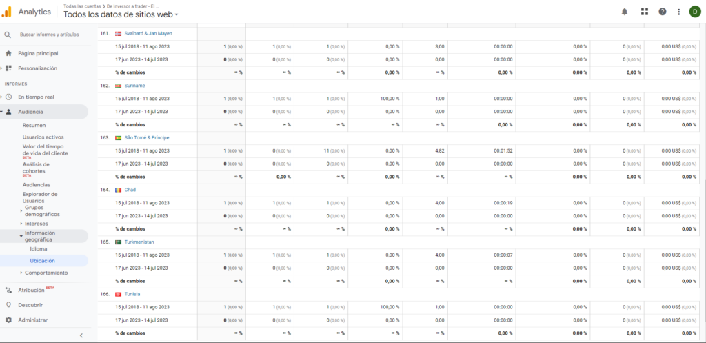 Tenemos usuarios de la web, hasta de 166 países, aunque muchos de ellos son con menos de 10 usuarios, es curioso ver los últimos de la lista, para entender el poder de internet en esta epoca.