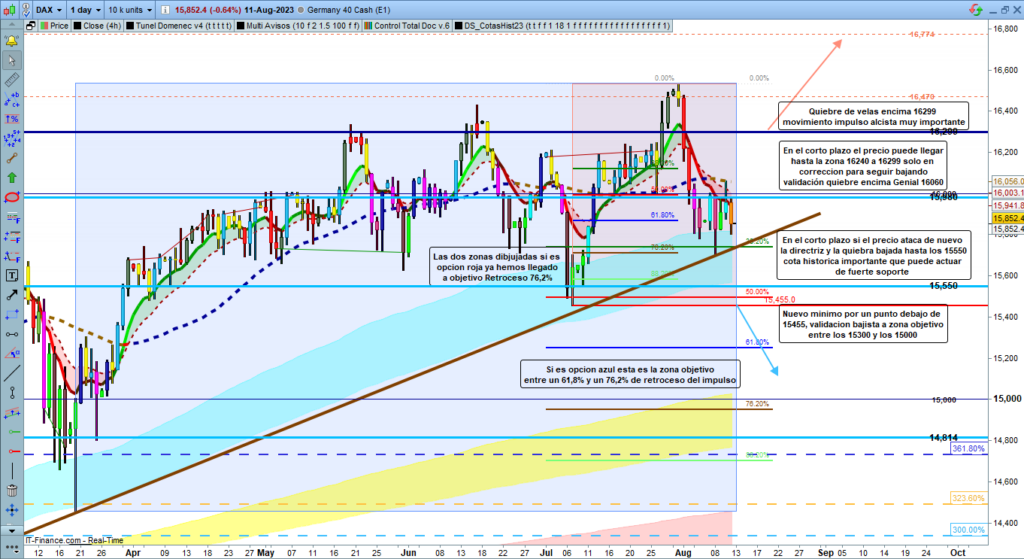 En el corto plazo, si el precio quiebra y confirma el último máximo en los, 15064, sin hacer antes un nuevo mínimo, el objetivo sería inicialmente la zona 16240 a 16299. Por la parte inferior, un nuevo ataque y quiebre de la directriz, objetivos 15624 y sobre todo 15550, cota histórica importante y protagonista este año 2023, que sin duda actuara de fuerte soporte independientemente de las posibles plumas.