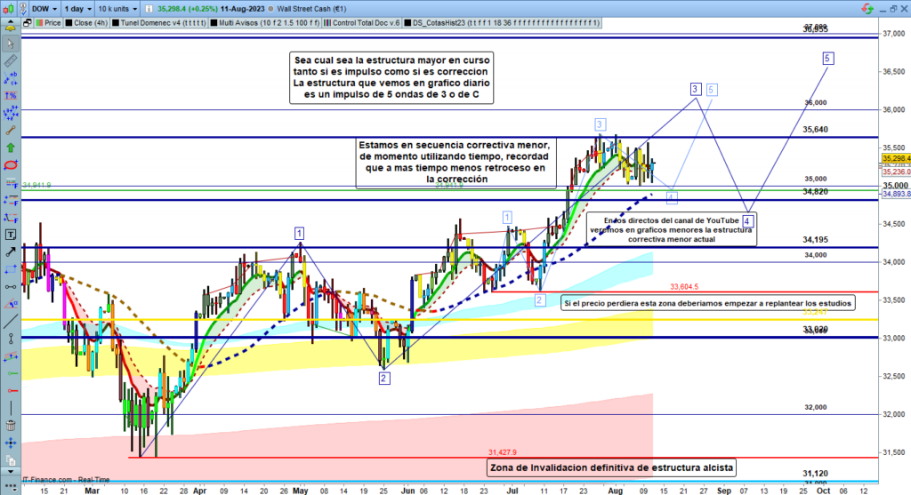 En gráfico diario del Dow, se ve con detalle la estructura, como siempre si tenemos en cuenta la opción más probable, en este caso, es bajada hasta la Genial de diario y la cota 34820. De todas maneras, solo operamos el movimiento cuando el precio esté por debajo de la zona de corrección y genial de gráficos medios H4 y H1.