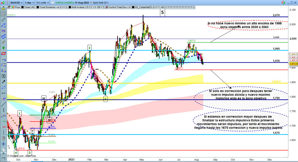 En gráfico diario del Oro, solo ver el detalle de lo anteriormente comentado. Aquí en diario vemos un detalle muy importante, si el precio tomara la opción bajista, fijaros que la cota 1790 coincide con la última onda 4, o sea, si estuviéramos solo haciendo una corrección menor para ir a nuevo máximo histórico, esta sería la zona máxima a alcanzar a nivel bajista. En cambio, si estamos en la opción más probable que ya he comentado, es muy posible en el caso de ser un impulso bajista acabe rompiendo la cota de los 1790, bajando incluso hasta la zona de los 1700 a 1670, antes de corregir.