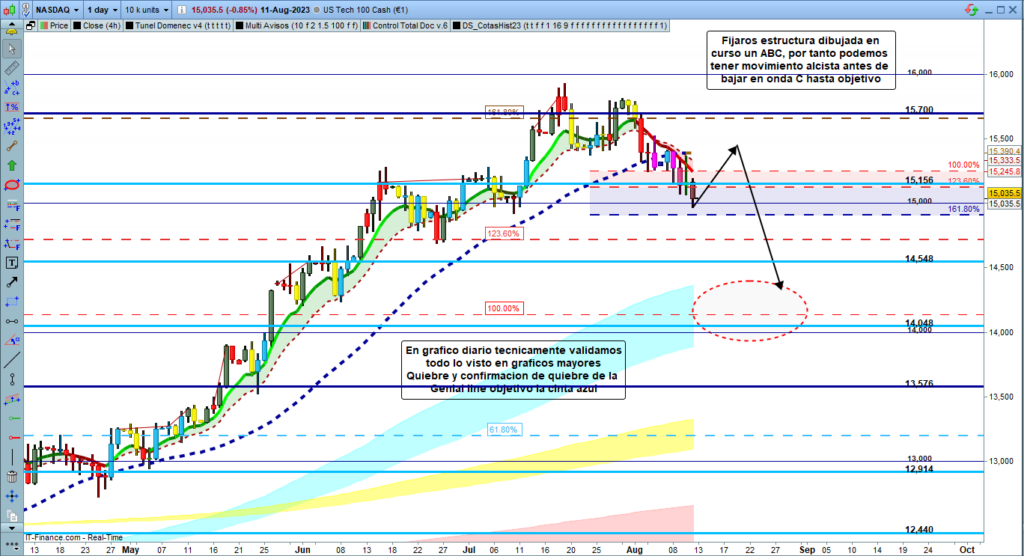 En gráfico diario del Nasdaq, detalle de la operativa a más corto plazo, estamos en zona de final de estructura, con lo que lo más probable, es que finalizado el actual impulso, corrección en dirección alcista para luego hacer un segundo movimiento bajista más importante, a la zona de la cinta azul.